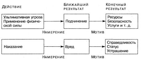 Последний, самый новый теоретический подход, рассматриваемый в данной главе, был предложен Тедеши и Фелсоном (Tedeschi & Felson, 1994), которые стремились развить анализ агрессивного поведения так, чтобы вписать его в более широкую «социально-интеракционистскую теорию принудительных действий». Понятию принудительного действия они отдают предпочтение по сравнению с традиционным понятием агрессии: а) они считают, что оно несет меньшую нагрузку ценностных оценок, позволяет избежать характеристики причинения вреда как законного или незаконного деяния; б) данное понятие включает в себя угрозы и наказания, равно как и применение физической силы в качестве важных способов причинения вреда или достижения покорности несогласного целевого субъекта. Большинство рассмотренных в предыдущих разделах подходов концентрировалось на враждебной или импульсивной агрессии. Модель же социального взаимодействия занимается инструментальной функцией принудительных действий. Она утверждает, что методы принуждения используются действующим субъектом с целью причинить своему объекту вред или заставить его исполнять определенные требования ради достижения трех основных целей: чтобы контролировать поведение других людей, восстановить справедливость и отстоять свою репутацию (Tedeschi & Felson, 1994, p. 348). Принудительные действия рассматриваются как последствия процесса принятия решений, при котором действующий субъект сначала решает использовать меры принудительного воздействия, а не ненасильственные способы, а затем выбирает из ряда доступных вариантов конкретный вид принуждения. Например, человек, цель которого состоит в том, чтобы заставить богатого родственника изменить свое завещание в его пользу, должен сначала решить, следует ли ему использовать ненасильственную форму социального воздействия, например лесть и мягкое убеждение, или стратегии принуждения, например угрозы или причинение физического вреда. Если принимается решение и пользу принудительного воздействия, следующим шагом будет выбор конкретного вида принуждения, который эффективнее всего в достижении намеченной цели. Ядро теории составляют три формы принудительного действия: а) угроза, т.е. сообщение объекту воздействия о намерении причинить ему вред, с особым ударением на ультимативном характере угрозы, который ставит причинение вреда в зависимость от отказа человека уступить определенным требованиям; б) наказание, т.е. действие, осуществляемое с намерением причинения человеку вреда; в) физическая сила, т.е. использование физического контакта с целью подчинить себе или ограничить поведение другого человека. Выбор метода принуждения определяется стремлением добиться определенного непосредственного или «ближайшего» результата, который в свою очередь мотивирован намерением достижения имеющей большую ценность конечной цели. Эти мотивационные основания принудительных действий указаны на рис. 2.2.