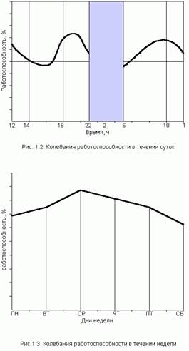 Колебание работоспособности. Зависимость работоспособности от времени суток. Колебание работоспособности в течение недели и рабочей смены
