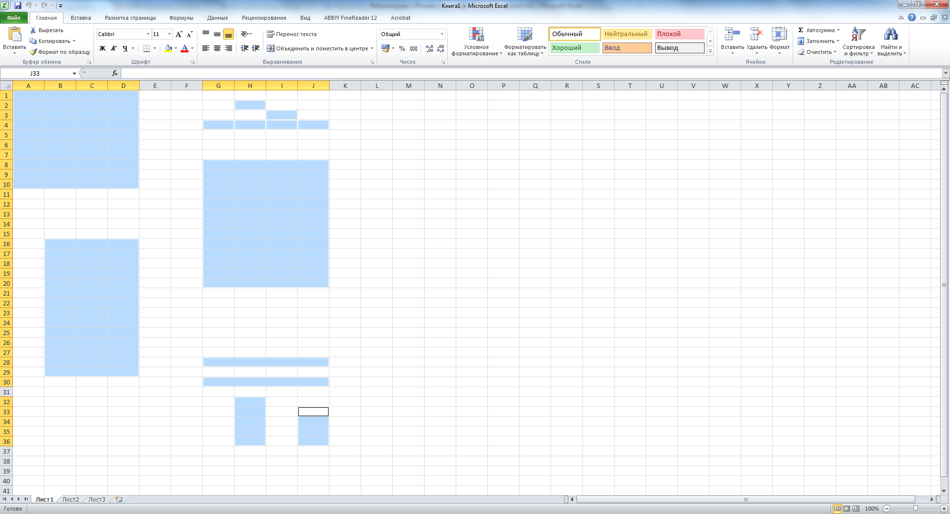 Чтобы выделить ячейки, установите курсор в нужную позицию и выделите смежные ячейки при помощи левой кнопки мыши. Чтобы выделить диапазон ячеек, установите курсор в левый верхний угол диапазона, удерживая клавишу Shift, установите курсор в правый нижний угол диапазона. Блок ячеек между этими позициями будет выделен. Чтобы выделить несмежные ячейки, производите выделение нужных ячеек при нажатой клавише Ctrl. Чтобы выделить строку/столбец, установите курсор на заголовок строки/столбца. Чтобы выделить несколько смежных строк/столбцов, установите курсор на заголовок строки/столбца начала диапазона, удерживая клавишу Shift, переместите курсор на заголовок строки/столбца конца диапазона. Чтобы выделить несмежные строки/столбцы, начинайте выделение нужных строк/столбцов при нажатой клавише Ctrl. Чтобы выделить все ячейки листа, примените комбинацию клавиш Ctrl+A, либо нажмите на кнопку на пересечении заголовков строк и столбцов (рис. 4.1). Для выделения текста внутри ячейки нужно войти в режим редактирования (по клавише F2 или дважды щелкнуть мышью по ячейке) и выделить нужный текст. В Excel 2010 возможно выделение ячеек, отвечающих определенным требованиям. Для этого используйте команду Главная→Редактирование→ Найти и выделить→Выделение группы ячеек и задайте в диалоговом окне нужные параметры выделения. Возможно одновременное выделение ячеек нескольких листов, для этого выделите нужные ячейки и щелкните на ярлыках листов, где вы хотите их выделить.