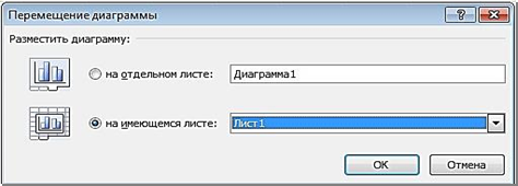 Если надо поместить диаграмму на другой лист, то выбираем команду Переместить диаграмму на вкладке Конструктор. Откроется диалоговое окно, в котором выбираем место расположения диаграммы.