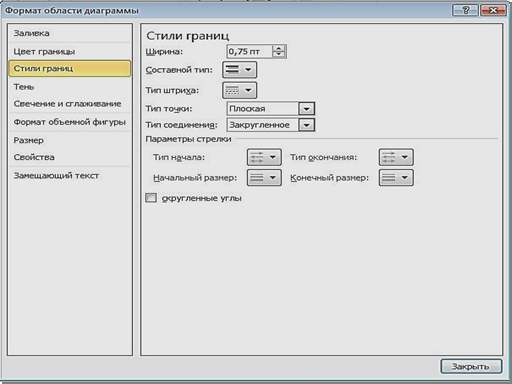 Готовую диаграмму можно перемещать по рабочему листу, изменять ее размер. Чтобы удалить диаграмму, нужно выделить ее и нажать клавишу Del. Если диаграмма расположена на отдельном листе – удалить лист. На вкладке Формат, в группе Размер, внизу справа по кнопке можно открыть диалоговое окно Формат области диаграмм. С помощью этого окна настраиваются дополнительные параметры оформления диаграмм. Здесь можно оформить границы (стиль, цвет), заливку, размер и др.