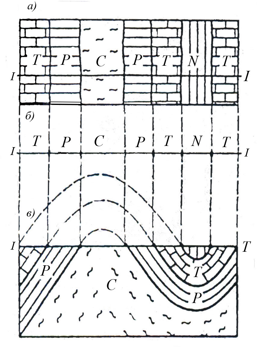 На рис.1а изображен фрагмент геологической карты (территории с примерно горизонтальной поверхностью рельефа масштаба 1:2000). Построим возможный разрез по линии 1—1. Предположим, что слои горных пород, залегают согласно, и каждый слой в пределах карты имеет постоянную мощность. Определим, какая форма нарушенного залегания пород (дислокация) видна на карте и разрезе. Между породами какого возраста наблюдается стратиграфический перерыв.