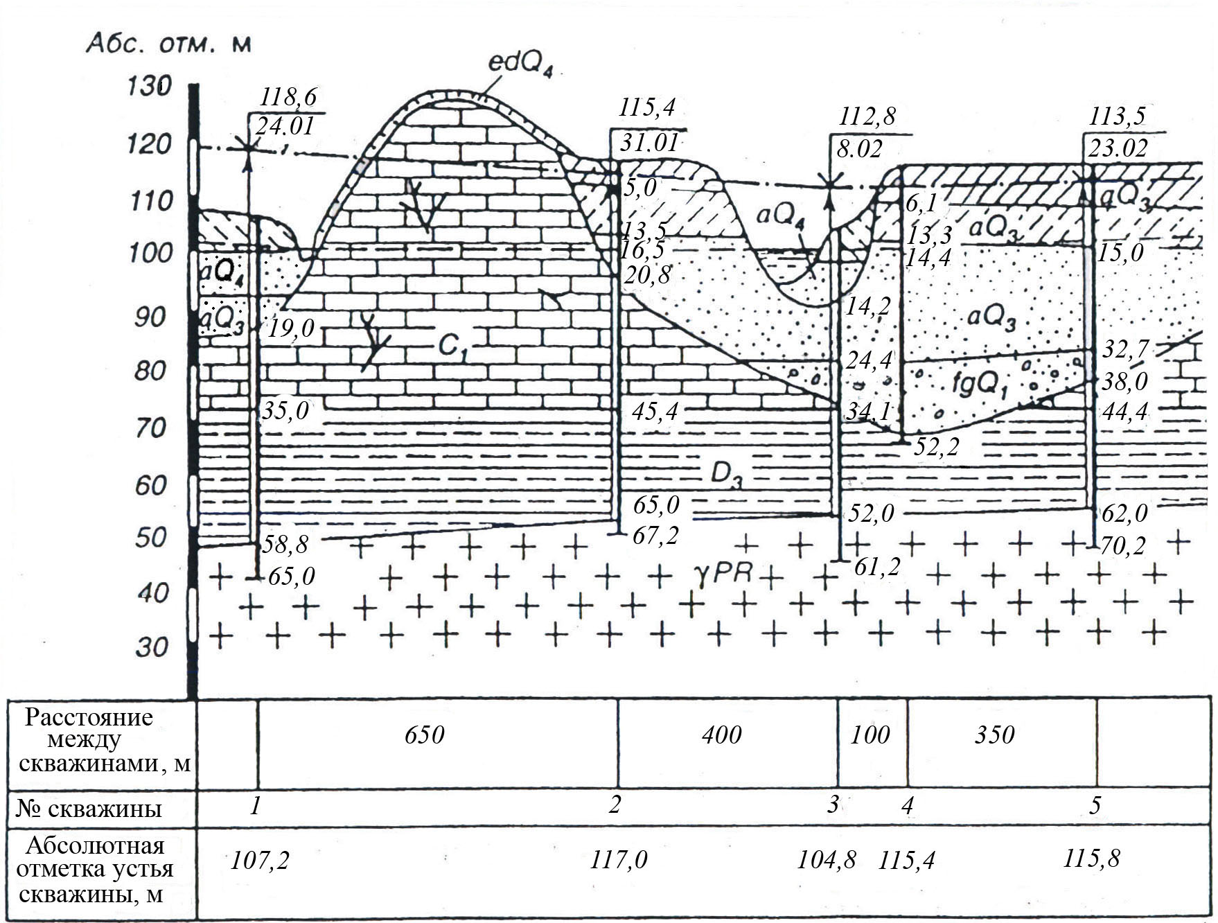 Рис. 6 Далее приступаем к построению топографического профиля. От левой шкалы в горизонтальном направлении откладываем в заданном масштабе расстояния от начала разреза до его пересечения с каждой горизонталью. Точками отмечаем абсолютные отметки соответствующих горизонталей. После этого откладываем от начала разреза расстояния до каждой скважины и проводим вертикальный штрих в верхней строке. Под штрихами указываем номера скважин, а ниже - абсолютные отметки их устьев, которые дают дополнительные точки для построения профиля. Соединив все точки плавными линиями, получаем топографический профиль поверхности земли по линии I - I. На построенный профиль наносим колонки буровых скважин. При крупном масштабе разреза ствол скважины обозначают двумя вертикальными отрезками, в остальных случаях - одним. На нижнем конце отрезка, соответствующем глубине пробуренной скважины (забою), ставим короткий поперечный штрих. Справа от штриха записываем глубину скважины. Вдоль линии скважины размечаем границы слоев и проставляем глубину залегания каждого слоя. В интервале каждого слоя (на полосе шириной 1...2 см) условными обозначениями, взятыми из стратиграфической колонки, отмечаем карандашом состав и относительный возраст пород. Далее на топографический профиль переносим с карты точки пересечения разреза со стратиграфическими границами и карандашом справа и слева от точек отмечаем относительный возраст пород. Например, левее скважины 2 на профиле отмечаем границу между нижнекаменноугольными известняками С1 и верхнечетвертичными отложениями (Q3). Прежде чем проводить границы слоев на разрезе, восстановим в общих чертах историю геологического развития изучаемого участка. Рассматривая стратиграфическую колонку и колонки скважин на разрезе, видим, что наиболее древними породами, вскрытыми скважинами, являются протерозойские граниты. Между ними и залегающими выше верхнедевонскими аргиллитами имеется стратиграфический перерыв, во время которого происходило разрушение гранитов, и формировался рельеф, поверхность которого могла иметь сложную форму. Это подтверждается тем, что кровля гранитов в скважинах 1, 2, 3, 5, попавших в разрез, вскрыта на разных абсолютных отметках (48,4; 52,0; 52,8; 53,8 м). На верхнедевонских аргиллитах залегают нижнекаменноугольные известняки. Граница между ними почти горизонтальна. В послекаменноугольное время вплоть до начала четвертичного периода осадконакопления на данном участке не происходило. В нижнечетвертичное время по пониженным частям рассматриваемой территории проходил поток, частично размывший нижнекаменноугольные известняки и верхнедевонские аргиллиты. Он выработал долину реки и оставил свои отложения в виде гравелистых песков с галькой (tgQ1). В верхнечетвертичное время река частично размыла флювиогляциальные отложения (образованные в результате таяния ледников), а затем оставила свои (Q3). Позже уровень реки несколько раз менялся, в результате чего были частично размыты верхнечетвертичные осадки, затем отложены современные (aQ4). Сделав этот анализ, на разрезе проводим возрастные границы, то есть, выделяем площади с одноименными индексами. Проще всего ограничить слой D3, сложнее оконтурить линзу Q3. В последнем случае пользуемся точками на профиле, снесенными с карты и точками на колонках скважи