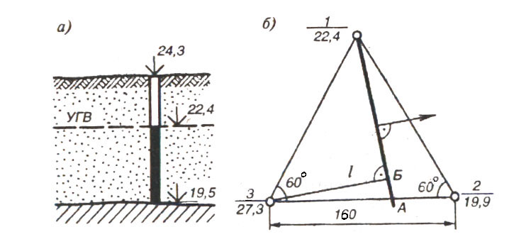 Колонка скважины приведена на рис. 11 а. Для определения направления потока составляют (в масштабе) план расположения скважин (рис. 11 б), указывают их номера и абсолютные отметки уровня грунтовых вод (УГВ) в каждой скважине. Направление потока в плане перпендикулярно гидроизогипсам (или их касательным в отдельных точках, если поток криволинейный). При наличии только трех скважин криволинейность потока не может быть учтена, и все гидроизогипсы будут параллельны, поэтому достаточно провести одну из них. С этой целью между скважинами с максимальной (27,3 м) и минимальной (19,9 м) отметками УГВ путем линейной интерполяции находят точку с отметкой, равной 22,4 м (точка А на рис. 116). Через точку А и скважину 1 проводят гидроизогипсу (жирная линия). Направление потока перпендикулярно гидроизогипсе и направлено в сторону понижения уровня грунтовых вод (показано стрелкой).
