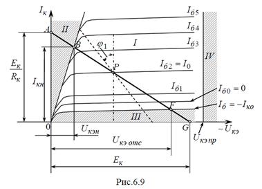 Для схемы включения БТ с ОЭ поведение входных характеристик (рис. 4.6.) объясняется так же как и для схемы с ОБ. На выходных характеристиках требует пояснения отличное от схемы с ОБ расположение области режима насыщения