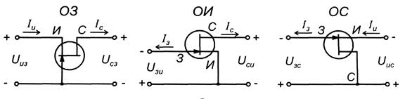 Рис 5.7. Статические характеристики МДП транзистора со встроенным каналом. Полевые транзисторы включаются по схемам с общим затвором (ОЗ) (рис. 5.8 а), общим истоком (ОИ) (рис.5.8а, б), общим стоком (ОС) (рис. 5.8, в). Наиболее часто используется схема включения с ОИ.