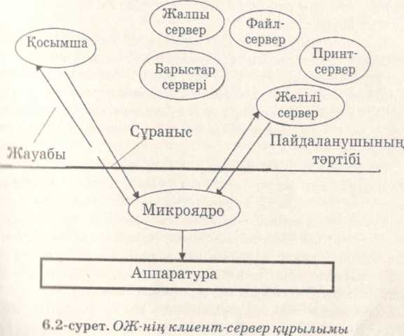 ОЖ-нің құрылымдастырылуына сәйкес негізгі ой оның бірнеше процестерге – әрқайсысы сервистік функциялардың жеке жиынын, мысалы, жадымен басқаруды, процестерді жасау немесе жоспарлауды орындайтын серверлерге бөлшектелуінде жатыр. Әрбір сервер пайдаланушылық тәртіпте орындалады. Не ОЖ-нің басқа компоненті не қолданбалы бағдарлама бола алатын клиент-серверге хабарлама жібере отырып сервисті сұрайды. ОЖ-нің ядросы (мұнда микроядро деп аталатын) басымдық (привилегированном) тәртіпте жұмыс істей отырып, хабарламаны керек серверге жеткізеді, сервер амалды орындайды, бұдан кейін ядро нәтижелерді басқа хабарламаның көмегімен клиентке қайтарады (6.2-сурет). Микроядроны қолданумен әдіс операциялық жүйенің функцияларының тік таратылуын көлденңге ауыстырды. Микроядрода арқылы қайта жіберілетін хабарламаларды пайдаланса да, бір-бірімен тікелей өзара әрекеттеседі. Микроядро жөнге салушы рөлін атқарады. Ол хабарламаларды тексереді, оларды серверлер мен клиенттер арасында жіберіп отырады және аппаратты пайдалануға рұқсат береді. Берілген теориялық үлгі ядросы тек хабарламаларды жіберу құралдарынан тұратын клиент-сервер жүйесінің идеализацияланған суреттеуі болып табылады. Шын мәнінде, ОЖ құрылымындағы клиент-сервер үлгісінің жүзеге асырылуының әр түрлі нұсқалары ядро тәртібінде орындалып жатқан жұмыс көлемі бойынша елеулі өзгеше болуы мүмкін. Осы спектрдің бір шетінде ОЖ-нің барлық мәнсіз функциялары ядро тәртібінде емес, пұрсатталмаған тәртіпте орындалуы керек дегеннен тұратын таза микроядролық доктринаны қолдайтын Масһ микроядросының негізінде IBM фирмасымен өндірілетін Workplace OS операциялық жүйесі орын алады. Басқа шетінде – құрамында ядро тәртібінде жұмыс істейтін және қауіпсіздікті қамтамасыз ету, енгізі-шығару және басқа функцияларды орындайтын негізгі жүйесі (NT executive) бар Windows NT. Микроядро мен оның айналасындағы модульдар ара- сындағы жұмыстың бөлінуінің негізгі принципі - мик- роядроға тек супервизор тәртібінде және пұрсатты кеңіс- тікте орындалуы өте ңажет функцияларды ғана қосу ке- рек. Әдетте бұл машиналық тәуелді бағдарламаларды (бірнеше процессорлардың ңолдауын ңосқанда), процес- термен басқарудың кейбір функцияларын, үзілулерді өңдеуді, хабарламаларды жіберуді қолдауды, құрылғы- лардың регистріне командаларды жүктеумен байланыс- ты енгізу-шығару құрылғыларымен басңарудың кейбір функцияларын білдіреді. Операциялық жүйенің бұл функцияларын пайдаланушының кеңістігінде жұмыс істейтін бағдарламаларға орындау қиын (егер мүлдем мүмкін болмаса). Қазіргі кезде нақ клиент-сервер үлгісін және микроядро тұжырымдамасын пайдаланумен жасалынған опе- рациялың жүйелер ең үлкен дәрежеде қазіргі ОЖ-ге қойылатын талаптарды қанағаттандырады. Көшірімділіктің үлкен дәрежесі барлық машиналық тәуелді код микроядрода оңашаланғандықпен шартталған, сондықтан жүйенің жаңа процессорға көшірілуі үшін аз өзгертулер керек және де олардың барлығы логикалық түрде бірге топтастырылған. Микроядролар технологиясы әр түрлі ОЖ үшін жазылған бағдарламалардың үйлесімділігін қамтамасыз ететін көптеген қолданбалы орталарды құрудың негізі болып табылады. Төменде орналасңан операциялық жүйелерден қолданбалы бағдарламалардың интерфейстерін абстракциялай отырып, микроядролар қолданбалы бағдарламаларға салынғандар б