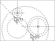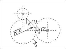 2.3.1 Постройте опорные линии для центров окружностей при помощи команды 2.3.2 Построить окружность радиусом 75 мм. Порядок построения: вызвать команду 2.3.3 Постройте сопрягающуюся окружность с внешним касанием. Порядок построения: подвести курсор к окружности (1) (Рисунок 12, б), дождаться момента, когда рядом с курсом высветится условный знак, обозначающий окружность (1), нажать левую клавишу мыши, затем аналогично, нажатием левой клавиши мыши, указать окружность (2). Значение радиуса 75 мм касающейся окружности задать в окне свойств элемента построения и нажать левую клавишу мыши в тот момент, когда рядом с курсором не высвечивается условный знак. 2.3.4 Постройте сопрягающуюся окружность с внутренним касанием. Порядок построения аналогичен рассмотренному в пункте 2.3.3. При этом после указания окружностей касания (1) и (2) (Рисунок 12, в) необходимо, двигая курсором мыши, выбрать внутренний тип касания, указать в окне свойств элемента построения радиус 170 мм и нажать клавишу «Enter» на клавиатуре или левую клавишу мыши в тот момент, когда рядом с курсором не высвечивается условный знак.