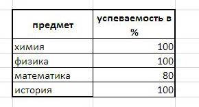 Заполним вторую таблицу на третьем листе, то есть посчитаем процент успеваемости по предметам. Если студент получил по экзамену оценку больше двойки, он считается успевающим. Вначале в дополнительной ячейке с помощью функции СЧЕТЕСЛИ посчитаем число студентов получивших по химии оценки больше двойки. В нашем примере таких 5 человек. Затем ссылаясь на дополнительную ячейку в ячейку Н4 введем математическую формулу для вычисления процента успеваемости. Для остальных предметов выполним аналогичные действия. В результате получим таблицу: