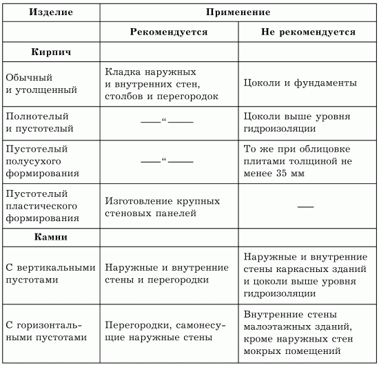 К ним относятся керамические и силикатные материал ы, а также бетонные смеси и бетоны. Керамические кирпичи и камни Их применяют при кладке наружных и внутренних стен и прочих конструкций, а также для изготовления стеновых панелей и блоков. Допускается также использование этих материалов при устройстве фундаментов и цоколей зданий. Изготавливаются из легкоплавких глин с добавками или без. Кирпичи бывают обычными (размер, мм: 65 х 120 х 250), утолщенными (80 х 120 х 250) и модульными (138 х 138 х 288). Толщина камня равна толщине двух кирпичей (включая растворный шов). Камни делятся на обычные (138 х 120 х 250), укрупненные (138 х 250 х 250), модульные (138 х 138 х 288) и с горизонтальным расположением пустот (120 х 250 х 250). Кирпичи бывают полнотелыми или пустотелыми, камни – только пустотелыми. По прочности кирпичи и камни делятся на марки – 75, 100, 125, 150, 175, 200, 250, 300 (по возрастанию прочности). Они должны быть нормально обожжены, так как недожженный материал (алого цвета) обладает недостаточной прочностью, пониженной водо– и морозостойкостью, а пережженный (темно-бурого цвета) – повышенной плотностью, теплопроводностью и зачастую имеет искаженную форму (табл. 2).