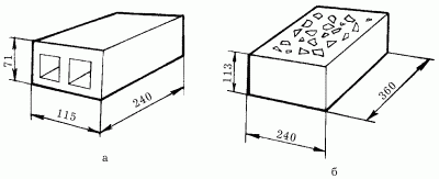 Кирпичи (размеры даны в мм): а – продольно-дырчатый; б – вертикально-дырчатый.