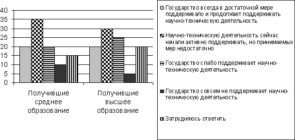 301. Учёные опросили совершеннолетних граждан страны Z, имеющих разный уровень образования. Им задавали вопрос: «В какой мере, по Вашему мнению, государство сегодня поддерживает научно-техническую деятельность?». Результаты опросов (в % от числа отвечавших) приведены на диаграмме.