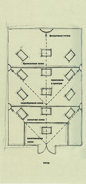 Четко определенные проходы создают обширное пространство, по которому покупатели могут спокойно бродить в отделе женской одежды универмага «Маркс и Спенсер». После того как проблема соседства товаров решена, пора приступать к детальной планировке торгового зала. Каждый покупатель, пробирающийся по лабиринту мебельного магазина «ИКЕА», ощущает, как тяжело не поддаться соблазну и не свернуть с намеченного маршрута. Как только покупатель вошел в магазин, ему ничего не остается, кроме как пересечь его весь в поисках выхода, а по пути он проходит через множество комнат, обставленных мебелью в различных стилях, а затем попадает на склад, где и тратит свои деньги. Даже во время ожидания в очереди его дети могут полакомиться мороженым. Мало кто понимает гениальность такой тщательно продуманной планировки торгового зала. Так же тщательно планируются в супермаркете бесконечные проходы между полками с товарами. Даже если эти проходы и полки не вдохновляют покупателей, они в конечном счете выполняют свою роль, превращая скучный процесс покупки бакалейных товаров в простое и легкое дело. Точное место нахождение молочных продуктов относительно, например, чистящих средств тщательно планируется, и не только для удобства покупателей, но и для стимуляции торговли. Основные продукты, такие как молоко и яйца, не всегда размещаются в передней части магазина; чаще всего они рас полагаются в центре магазина или в его задней части, и делается это намеренно, чтобы покупатели по пути к ним проходили мимо других товаров. В поисках того, что им нужно, покупатели по пути могут положить корзину и те продукты, которые не намеревались покупать. Даже края витрин и прилавков используются для увеличения продаж, в самых оживленных проходах на них размещаются дополнительные товары, притягивающие внимание покупателей. Каждый из этих примеров доказывает эффективность продуманного планирования торгового зала.