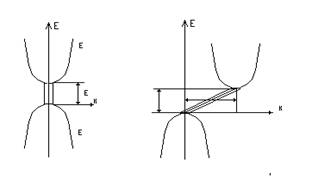 Предположим, что в результате какого-то внешнего воздействия полупроводник выведен из состояния термодинамического равновесия, причем в нем созданы одновременно высокие концентрации электронов в зоне проводимости и дырок в валентной зоне. Электроны переходят в состояние с некоторой энергией Fn вблизи потолка валентной зоны. Рассматриваемая ситуация иллюстрируется диаграммами, приведенными на. рис. 1 Так как все состояния вблизи дна зоны проводимости заполнены электронами, а все состояния с энергиями вблизи потолка валентной зоны заполнены дырками, то переходы с поглощением фотонов, сопровождающиеся увеличением энергии электронов становятся невозможными. Единственно возможными переходами электронов в полупроводнике в рассматриваемых условиях являются переходы зона проводимости - валентная зона, сопровождающиеся рекомбинацией электронно-дырочных пар и испусканием электромагнитного излучения. В полупроводнике создаются условия, при которых происходит усиление электромагнитной волны. Иными словами, коэффициент поглощения получается отрицательным, а рассматриваемая ситуация отвечает состоянию с инверсной плотностью населенности. Поток квантов излучения, энергия которых находится в пределах от hv=Ec-Ev до hv=Fn-Fp, распространяется через возбужденный полупроводник беспрепятственно. Для реализации процесса излучательной рекомбинации необходимо выполнить два условия. Во-первых, электрон и дырка должны локализоваться в одной и той же точке координатного пространства. Во-вторых, электрон и дырка должны иметь одинаковые по значению и противоположно направленные скорости. Иными словами, электрон и дырка должны быть локализованы в одной и той же точке k-пространства. Так как импульс образующегося в результате рекомбинации электронно-дырочной пары фотона значительно меньше по сравнению с квазиимпульсами электрона и дырки, то для выполнения закона сохранения квазиимпульса требуется обеспечить равенство квзиимпульсов электрона и дырки, участвующих в акте излучательной рекомбинации. Оптическим переходам с сохранением квазиимпульса соответствуют вертикальные в k-пространстве (прямые) переходы. Сохранение квазиимпульса в процессе излучательного перехода может рассматриваться как квантомеханическое правило отбора (в том случае, когда в акте излучательной рекомбинации не принимают участие третьи частицы, например, фононы или атомы примесей). Невертикальные в k-пространстве (непрямые) переходы имеют значительно меньшую вероятность по сравнению с прямыми переходами, так как в этом случая требуется сбалансировать некоторый разностный квазиимпульс dk (рис. 2).