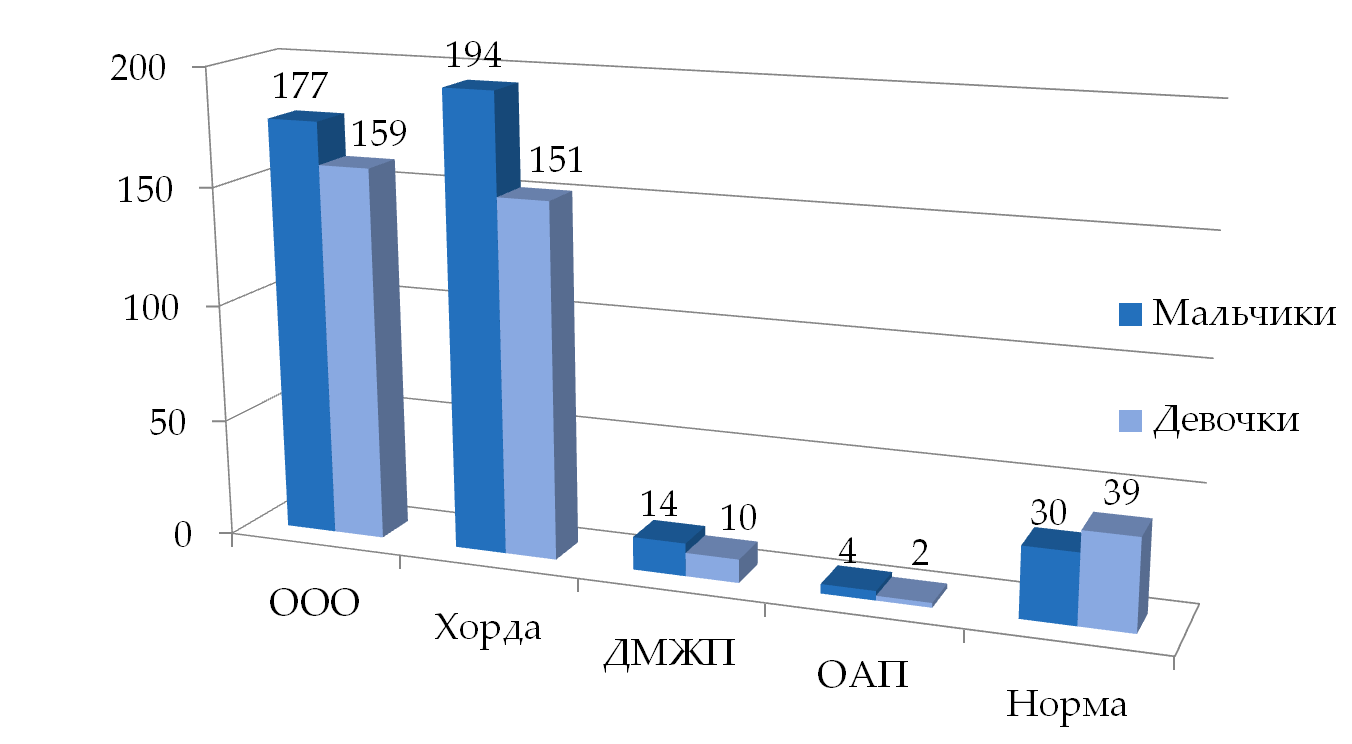На графике стоит отметить, что ООО и хорда – изменения, наиболее часто встречающиеся на 1 месяце, но они не являются грубой патологией и на первых месяцах жизни считаются нормой. ДМЖП - у 9 детей из 501. Норма – 27 детей.