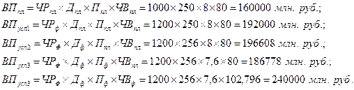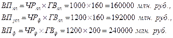 Расчет изменения ВП за счет ЧР: ВП усл – ВП пл = 192 000 – 160 000 = + 32 000 млн.руб. Расчет изменение ВП за счет ГВ: ВП ф – ВП усл = 240 000 – 192 000 = + 48 000 млн.руб. Проверка: