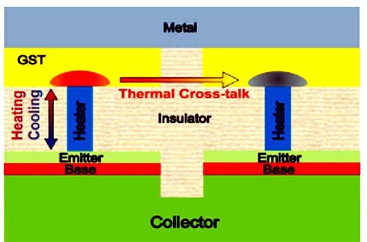 На рисунке 1 показана конструкция PCM элемента, управляемого биполярным транзистором. Использование биполярных транзисторов в первых элементах было обусловлено сравнительно большим током плавления кристаллических элементов. В дальнейшем некоторое снижение токов записи позволило заменить биполярный транзистор МОП транзистором. При этом основные элементы конструкции остались неизменными.