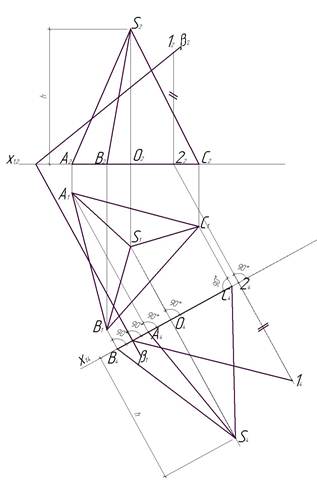 Этап 1 (рис.15). Решение задачи начнем на горизонтальной плоскости проекций. Здесь к горизонтальному следу заданной плоскости (β1) проведем (в произвольной точке) линию, перпендикулярную этому горизонтальному следу. Эта линия будет осью новой плоскости проекций π4, обозначим ее Х1,4. Теперь опустим перпендикуляры из точек А1, В1, С1 и S1 на ось Х1,4. Получим точки В4, А4, С4 и О4. Это точки основания пирамиды в новой плоскости проекций. У пирамиды есть вершина – S, которую мы еще не построили. Это можно сделать следующим образом: от точки О4 продолжим перпендикуляр вниз и на нем отложим отрезок h, равный расстоянию от S2O2 на фронтальной плоскости проекций.