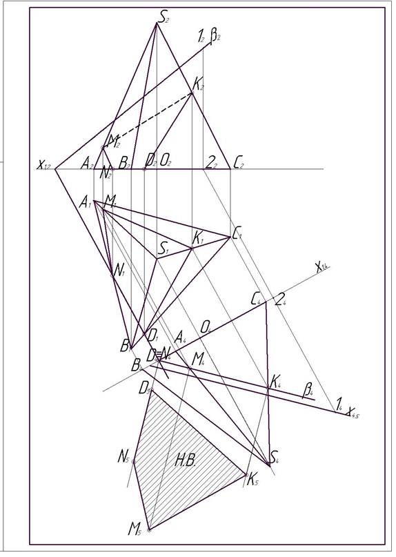 Так как точки N4 и D4 по построению совпали, то они расположились на одной прямой. Обозначим полученные точки N5, M5, K5, D5. Соединив их отрезками, мы получим натуральную величину сечения пирамиды, плоскостью β, которая задана следами.