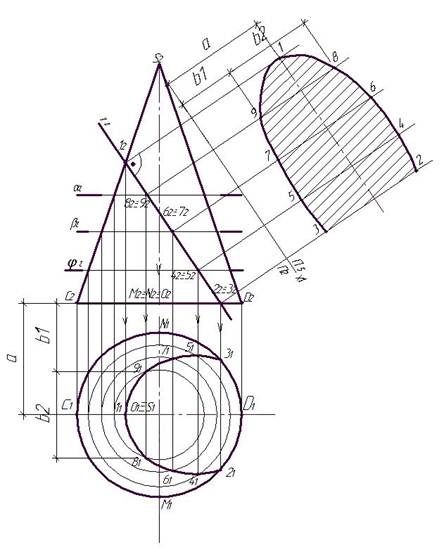 Этап 2 (рис.20). На данном этапе необходимо соединить найденные точки сечения на горизонтальной проекции конуса.