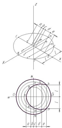 Полученные точки (1,2,3,4.5,6,7,8,9) соединяются плавной линией. В заключение работы определяются видимые участки сечения. Пример выполнения эпюра №3 представлен на рис. 24.