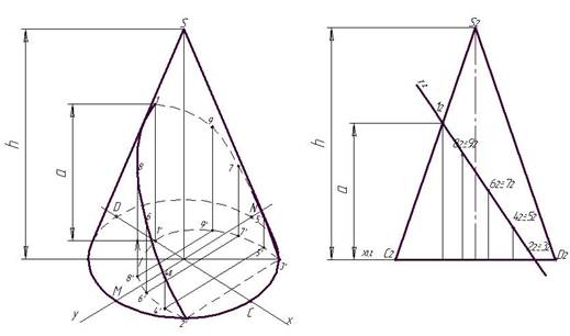 На рис. 22 показано построение проекций точек, лежащих в основании конуса.