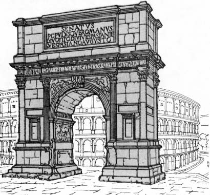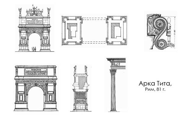Триумфа́льная а́рка — архитектурный памятник, представляющий собой большую торжественно оформленную арку. Триумфальные арки устраиваются при входе в города, в конце улиц, на мостах, на больших дорогах в честь победителей или в память важных событий. Триумфальная арка Тита (итал. Arco di Tito) — однопролётная арка, расположенная на древней Священной дороге (Via Sacra) к юго-востоку от Римского форума. Построена Домицианом вскоре после смерти Тита в 81 году н. э. в память о взятии Иерусалима в 70 году н. э. Послужила моделью для многих триумфальных арок Нового времени. Существовала также другая, трёхпролётная арка Тита, воздвигнутая Сенатом в 81 году н. э. в восточной оконечности ипподрома Циркус Максимус Высота монумента составляет 15,4 м, ширина 13,5 м, глубина пролёта 4,75 м, ширина пролёта — 5,33 м. Выстроен из пентельского мрамора, добываемого в Аттике. Полуколонны, которыми декорирована арка, являются первым известным примером композитного ордера. В углах возле пролёта арки высечены четыре крылатых Виктории. Внутри пролёта находятся два барельефа: шествие с трофеями, захваченными в Иерусалиме (особенно выделяется менора), и император Тит, управляющий квадригой. Статуя Тита на квадриге также находилась на вершине арки, однако до наших дней не сохранилась. На софите находится барельеф с изображением апофеоза (обретения божественной сущности) императора. После пожара в эпоху Нерона верхняя часть Священной дороги (скорее всего, она называлась clivus Sacer) заканчивалась ступенями храма Венеры и Ромы. Еще можно увидеть часть древней базальтовой дороги и по ее бокам, на северной и южной сторонах, остатки фундаментов двух величественных сооружений с пилястрами (Horrea Piperataria). Под дорогой сохранилось базальтовое покрытие времен Августа, ведущее к Палатинскому холму. Священная улица периода республики пролегала не по этому пути, а поворачивала на восток, в направлении Карин. Перепад уровней этих улиц легко виден как раз в месте расположения арки Тита. Это сооружение, построенное на мощении эпохи Нерона, кажется повисшим в воздухе вместе с его фундаментом, выявленным во время раскопок уровня, предшествующего эпохе Нерона. Арка сохранилась благодаря тому, что была частью укрепления Франджипане. Не достает большинства пилонов, отреставрированных с помощью травертина Валадьером в 1822 г., — событие, о котором гласит соответствующая надпись на аттике со стороны Форума. С другой стороны аттика сохранилась подлинная надпись, благодаря которой можно точно опознать сооружение, не упоминающееся в античной литературе, если не считать сомнительный отрывок Марциала. Арка на рельефном изображении в гробнице Гатериев эпохи Домициана или Траяна (на которой можно прочесть arcus in Sacra Via Summa, т. е. «арка в верхней части Священной дороги») не может быть аркой Тита, потому что та не находилась на Священной дороге. Надпись на арке Тита гласит: Senatus / populusque romanus / divo Tito divi Vespasiani f(ilio) / Vespasiano Augusto («Сенат и римский народ божественному Титу, сыну божественного Веспасиана, Веспасиану Августу»). Упоминание Тита как «божественного» означает, что в то время, когда делали эту надпись, император был мертв. Таким образом, арку можно отнести к периоду после 81 г., и, скорее всего, она была сооружена по приказу последнего императора династии Флавиев Домициана, брата Тита и сына Веспасиана. Некоторые 