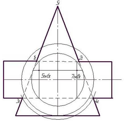 Этап 2. Найдем точки пересечения окружностей с проекциями конуса и цилиндра, соединим противоположные точки прямыми линиями. Пересечения этих прямых линий и будут искомые точки сечения (рис. 36). Соединим найденные точки плавной кривой линией, обозначим Rmin и Rmax (рис.37). В завершении задачи определим видимые и невидимые линии конуса и цилиндра.