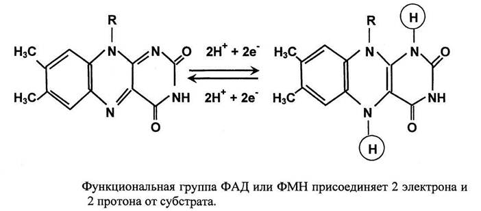 НАД-зависимые дегидрогеназы содержат НАД+ в активном центре и при взаимодействии с субстратом отбирают от него два электрона и протон, которые присоединяются к молекуле НАД+ образуя НАДН (Рис. 18). Поскольку НАД+ или НАДН находятся в активном центре дегидрогеназ не постоянно - их рассматривают в качестве вторых субстратов реакции и переносчиков электронов. Флавиновые дегидрогеназы содержат ФАД или ФМН (флавин адениндинук-леотид или флавин мононуклеотид) в активном центре. Флавиновые дегидрогеназы катализируют реакции переноса электронов в составе атомов водорода от субстрата на ФАД или ФМН (Рис. 20).