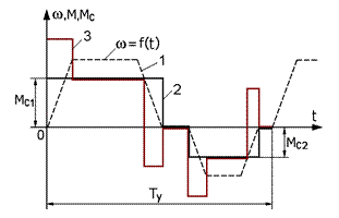 В виде примера на рисунке изображена тахограмма механизма циклического действия (ломаная 1). Ломаная 2 – примерный вид нагрузочной диаграммы механизма Mc=f(t). Нагрузочная диаграмма электропривода M=f(t) имеет вид ломаной 3. Из сравнения данного рисунка с предыдущим, можно сделать вывод, что механическая инерция электропривода механизмов циклического действия является фактором, увеличивающим нагрузку двигателя. Нагрузочная диаграмма электропривода этих механизмов является существенно неравномерней, чем у механизмов непрерывного действия.