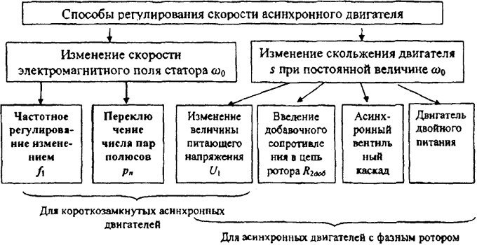 Асинхронный двигатель является наиболее массовым электрическим двигателем. Эти двигатели выпускаются мощностью от 0,1 кВт до нескольких тысяч киловатт и находят применение во всех отраслях хозяйства. Основным достоинством асинхронного двигателя является простота его конструкции и невысокая стоимость. Однако по принципу своего действия асинхронный двигатель в обычной схеме включения не допускает регулирования скорости его вращения. Особое внимание следует обратить на то, что во избежание значительных потерь энергии, а, следовательно, для короткозамкнутых асинхронных двигателей во избежание перегрева его ротора, двигатель должен работать в длительном режиме с минимальными значениями скольжения. Рассмотрим возможные способы регулирования скорости асинхронных двигателей (см. рис.1). Скорость двигателя определяется двумя параметрами: скоростью вращения электромагнитного поля статора ω0 и скольжением s:
