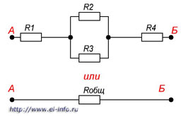 Смешанное соединение резисторов является комбинацией последовательного и параллельного соединения. Иногда подобную комбинацию называют последовательно-параллельным соединением.