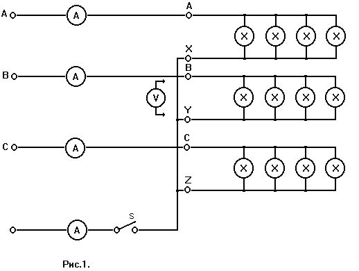 Время-2 час. Цель:Сформировать знания студентов об исследовании трехфазной четырехпроводной электрической цепи синусоидального тока и уметь собирать схемы соединения