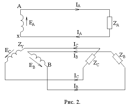 Трехфазной системой переменных токов называется совокупность трех однофазных электрических цепей, в которых действуют три синусоидальные ЭДС одинаковой частоты, сдвинутые по фазе на 1/3 периода и создаваемые одним источником электрической энергии. Обмотки фаз генератора имеют одинаковое число витков и выполняются из провода одинакового сечения, поэтому ЭДС, индуктированные в этих обмотках, равны по величине. Если каждая из трех фаз генератора работает на отдельную нагрузку, то в этом случае имеет место несвязанная трехфазная система, в которой генератор соединен с нагрузкой 6-ю проводами (рис.2).