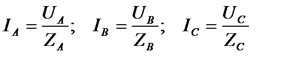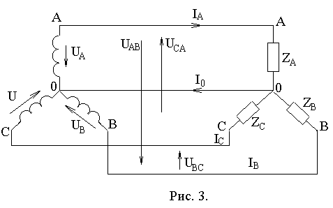 Чтобы соединить фазы нагрузки по схеме "звезда", следует все концы фаз этого потребителя соединить в одну точку, а начала фаз линейными проводами соединить с источником энергии. Точки соединения концов фаз генератора (0) и нагрузки (0`) называются соответственно нулевыми, или нейтральными точками генератора и нагрузки. Обе эти точки соединяются проводом, называемым нулевым или нейтральным. Таким образом, генератор соединен с нагрузкой четырьмя проводами, поэтому такая система называется трехфазной четырехпроводной. Токи, протекающие в фазах генератора или нагрузки, называются фазными и обозначаются: IА; IВ; IС или в общем виде IФ. Токи, протекающие по линейным проводам, называются линейными IЛ. При соединении "звездой" фаза генератора, линейный провод и фаза нагрузки соединены последовательно, поэтому IЛ = IФ. По нейтральному проводу протекает ток, равный геометрической сумме трех токов: IО= IА+IВ+IС или алгебраической сумме комплексов этих токов: IО=IА+IВ +IС. Напряжения, измеренные между началом и концом каждой фазы, называются фазными и обозначаются: UА; UВ; UС или в общем виде UФ. Напряжения UАВ; UВС; UСА называются линейными и измеряются между линейными проводами, т.е. между началами фаз. В линейных проводах принято считать положительными направления токов от генератора к нагрузке, а в нейтральном - от нагрузки к генератору. Благодаря наличию нейтрального провода, фазные напряжения потребителя остаются неизменными как при симметричной, так и при несимметричной нагрузке. Если ток в нейтральном проводе равен нулю, что может иметь место при симметричной нагрузке, то трехфазная система может стать трехпроводной (рис.4).