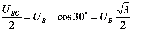 А). б). Векторная диаграмма рис.5 (а) называется топографической (каждая точка этой диаграммы соответствует точке на схеме). Из векторной диаграммы рис.5 (б) видно, что "звезда" фазных напряжений отстает от "звезды" линейных напряжений на угол 30°. Соотношение между величинами фазных и линейных напряжений для симметричной нагрузки можно вывести, рассматривая один из треугольников, составленных векторами фазных и линейных напряжений.