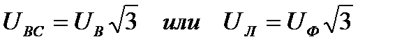 Соотношения между линейными и фазными напряжениями устанавливаются на основании второго закона Кирхгофа. При этом уравнения для действующих значений записываются в векторной (1) или комплексной (2) форме: