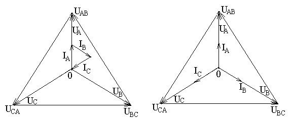 Т.е., линейное напряжение в случае симметричной нагрузки и при наличии нейтрального провода в UО - напряжение, измеряемое между нейтральными точками генератора и потребителя. СЛУЧАЙ СИММЕТРИЧНОЙ НАГРУЗКИ. Нагрузка, подключенная к трехфазному генератору, может быть симметричной и несимметричной. Симметричной называется такая нагрузка, при которой сопротивления фаз одинаковы по величине и по характеру, т.е. ZА = ZВ = ZС = r + jx При симметричной нагрузке токи в фазах по величине равны между собой. IА = IВ = IС, где На Рис.6 показаны векторные диаграммы напряжений и токов для симметричной активной нагрузки (а) - при наличии нейтрального провода (IА + IВ + IС = IО = 0), а (б) - без нейтрального провода.