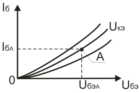 Рис. 2.6. Входная характеристика транзистора При открытом первом переходе ток базы Iб (т. е. входной ток) сильно зависит от прямого напряжения на базе Uбэ и мало зависит от обратного напряжения Uкэ (при его большом значении). При увеличении обратного напряжения Uкэ входная характеристика немного смещается вниз, что объясняется уменьшением тока базы из-за увеличения тока коллектора. Используя входную характеристику транзистора, можно определить его входное сопротивление Rвх для определенного положения рабочей точки А (см. рис. 2.6). Для этого при постоянном напряжении на коллекторе Uкэ задают приращение тока базы ∆Iб и определяют получающееся при этом изменение напряжения на базе ∆Uбэ. Входное сопротивление транзистора определяют как отношение Rвх = ∆Uбэ / ∆Iб. Выходные характеристики транзистора, включенного по схеме с общим эмиттером, представляют собой зависимости коллекторного тока от напряжения на коллекторе: Iк = f(Uкэ) при Iб = const. На рис. 2.7 приведены выходные характеристики транзистора включенного по схеме с общим эмиттером. С увеличением тока базы Iб характеристики смещаются вверх. Связь между током коллектора Iк и током базы Iб определяется коэффициентом передачи тока базы β = ∆Iк /∆Iб, который легко можно выразить через известный коэффициент передачи тока эмиттера а: β = ∆Iк /∆Iб = ∆Iк /(∆Iэ-∆Iк) = а /(I - а). Коэффициент передачи тока базы β зависит от напряжения на коллекторе Uкэ и от тока эмиттера Iэ.