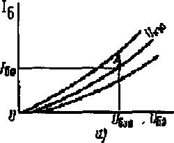 Рис.2.5. Транзистор типа n-р-n: а) – структура; б) – условное обозначение При подаче указанных напряжений в структуре транзистора происходят следующие явления. Поскольку на эмиттерный p-n-переход подано прямое напряжение, возникает инжекция, т. е. введение электронов из эмиттера в базу. Одновременно инжектируют и дырки из базы в эмиттер, но этим явлением можно пренебречь, т. к. база имеет меньшую концентрацию примесей по сравнению с эмиттером, а, следовательно, и меньшую концентрацию носителей заряда. Небольшая часть инжектированных электронов (1–3 %) рекомбинирует с дырками базы. За счет этого по проводу, соединенному с базой, будет протекать небольшой ток базы Iб. Остальная часть электронов (α = 0,97÷0,99) проникает далее в коллектор. Этому способствует положительный заряд коллектора, а также то, что базу намеренно выполняют очень тонкой (порядка 1 мкм). Из такого рассмотрения легко понять механизм усиления схемы ОЭ по току и напряжению. Действительно, пусть за счет входного переменного сигнала напряжение Uбэ изменяется. Это приведет к значительным колебаниям инжектированного эмиттером тока. Наиболее значительная часть этого тока будет протекать в коллектор, а на долю базы опять будет приходиться только небольшая часть тока. Это означает, что хотя входной ток базы небольшой, однако он вызывает значительные колебания тока на выходе. Если же в коллекторную цепь включить резистор с достаточно большим сопротивлением, то в соответствии с законом Ома колебания тока вызовут увеличение амплитуды колебания напряжения, т. е. произойдет усиление сигнала и по току, и по напряжению. Поскольку полярность напряжений, подаваемых на базу и коллектор, положительная, обе цепи можно питать от одного источника, на базу напряжение подают с помощью делителя, т. к. оно должно быть небольшим. Параметры транзистора можно определить по его входным и выходным характеристикам. Входные характеристики транзистора, включенного по схеме с общим эмиттером, представляют собой зависимости тока базы от напряжения на базе: Iб = f(Uбэ) при Uкэ = const. На рис. 2.6 приведены входные характеристики транзистора при его включении с общим эмиттером.
