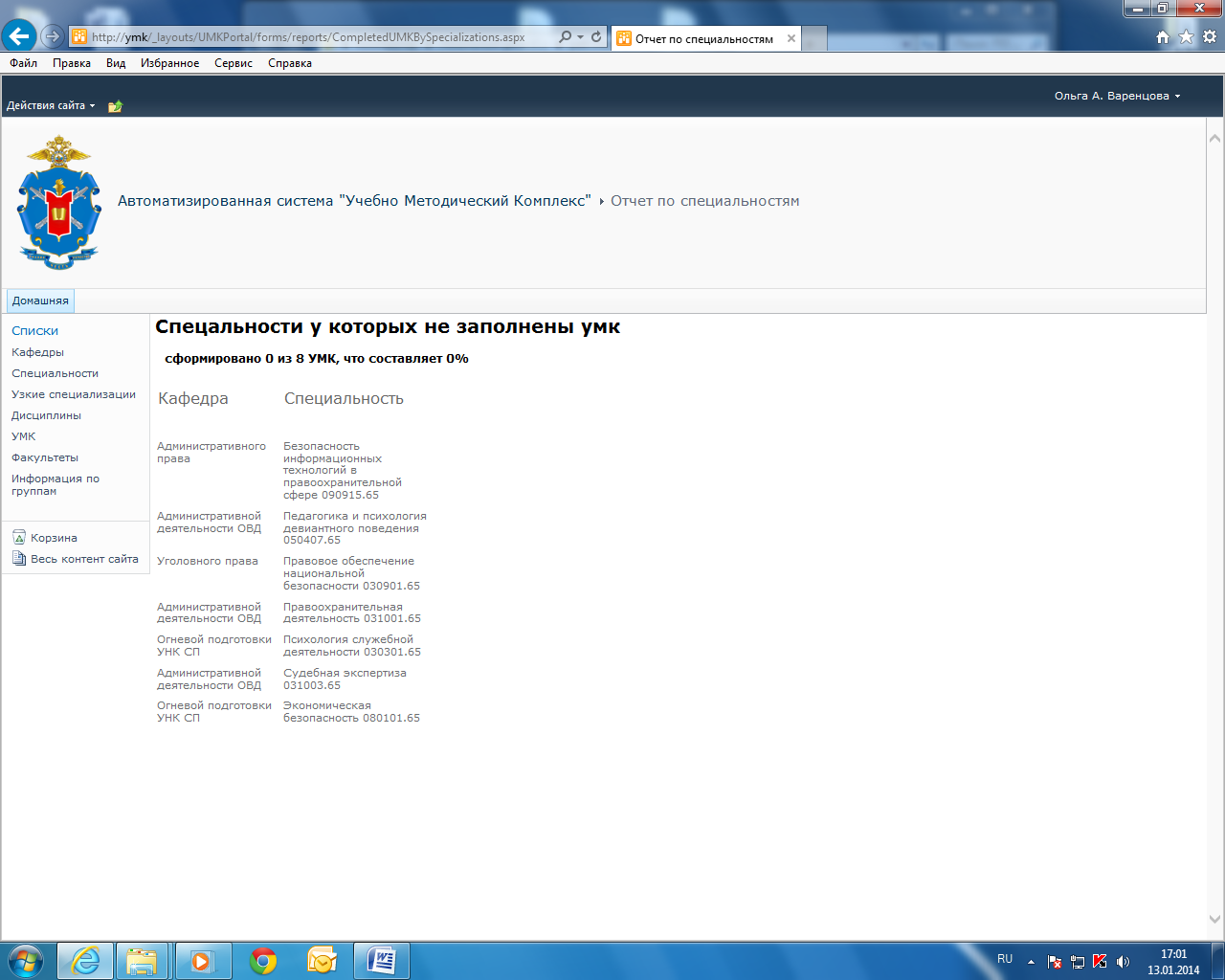 Рис. На скриншоте 7 специальностей данные статистики показывают) из 8 УМК, где еще одна специальность?? Всего в базе 10 специальностей, по 3 специальностям (Организация работы с молодежью – 1 каф., Юриспруденция- 19 каф., Правоохранительная деятельность- 2 каф.) еще не все кафедры закреплены соответственно УМК по ним не созданы, таким образом получается, что УМК должно быть заполнено по 7 специальностям, а не по 8