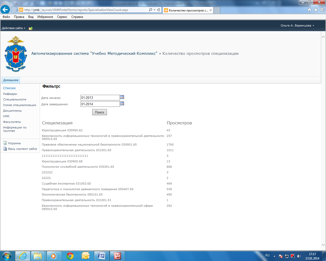 В октябре 2013 года отображается перечень из 10 кафедр http://ymk/_layouts/UMKPortal/forms/reports/ChairViewCount.aspx Фильтр: