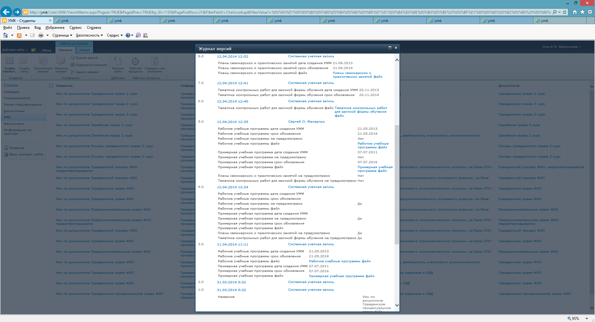 http://ymk/_layouts/UMKPortal/forms/reports/VisitedByChair.aspx Как считается данный вид статистики??? ______________________________________________________________________________________________ Выдавал ошибку по кафедре Гражданского права 14.04.2014, а 15.04.2014 уже не было ошибки, однако в журнале версий на момент проверки 14.04.2014 года отображается однократно учетная запись преподавателя вносившего информацию в ЭУМК