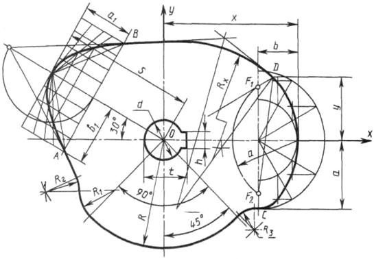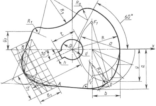 Указания по выполнению задания. В связи с огромным развитием автоматики можно встретить в самых разнообразных механизмах плоские кулачки и копиры. В заданиях к теме 1 очертания кулачков включают две лекальные кривые и дугу радиуса R угол которой определяет время «выстоя» механизма, получающего движение от кулачка. После нанесения на лист рамки рабочего поля и основной надписи (рис. 11) приступают к построению очертания кулачка. Все линии должны быть тонкими, но четкими, выполняемые с легким нажимом остроотточенным карандашом марки Т или 2Т (Н или 2Н). Построение в каждом варианте следует начинать с нанесения осей координат Ох и Оу. Затем строят лекальные кривые по их заданным параметрам и выделяют участки, входящие в очертание кулачка. После этого можно вычертить плавные переходы между лекальными кривыми. При этом следует учесть, что во всех вариантах через точку D проходит касательная к эллипсу. Обозначение RX показывает, что величина радиуса определяется построением. На чертеже вместо RX надо проставить соответствующее число со знаком «*». После выполнения построений в тонких линиях необходимо заполнить основную надпись чертежа и выполнить его окончательную обводку карандашом марки ТМ или М (НВ или В), принимая толщину линий согласно ГОСТ 2.303 - 68.