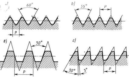 Общие сведения о резьбе. Терминология. Резьба образуется при винтовом перемещении некоторой плоской фигуры, задающей так называемый профиль резьбы (рис. 25), расположенной в одной плоскости с осью поверхности вращения (осью резьбы) - цилиндрической, конической, по которой профиль совершает свое движение. Часть резьбы, образованную при одном повороте профиля вокруг оси, называют витком. При этом все точки производящего профиля перемещаются параллельно оси на одну и ту же величину, называемую ходом резьбы. Резьбу, образованную движением одного профиля, называют однозаходной, образованную движением двух, трех одинаковых профилей и более - многозаходной. Шагом резьбы Р называют расстояние между соседними одноименными боковыми сторонами профиля в направлении, параллельном от резьбы. Очевидно, у однозаходной резьбы ход равен шагу (рис. 26, а), у многозаходной ход равен шагу, умноженному на число ходов (рис. 26, б).