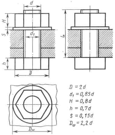 Размеры изображаемых деталей берутся из соответствующих стандартов. Чертежи следует выполнить карандашом на листе формата A3. На чертежах должны быть полностью указаны размеры изображаемых деталей, а на изображениях болтового и шпилечного соединения - только те, которые указаны на рисунке 35. Над изображениями необходимо написать соответствующие условные обозначения или другие поясняющие надписи, как это сделано на рисунке 35. Примечания: 1. При наличии у болта отверстия под шплинт размеры шплинта подбирают по ГОСТ 397 - 79, причем шплинт в этом случае подлежит вычерчиванию наряду с болтом, гайкой и шайбой. 2. Если в шпилечном соединении применяется прорезная или корончатая гайка, то она должна навинчиваться на шпильку так, чтобы конец последней выступал из гайки не более чем на 3 - 5 мм, причем шплинт (диаметр и длина) подбирается по ГОСТ 397 - 79. 3. Если в графе «Исполнение» стоит прочерк, то это означает, что изделие изготовляется в единственном исполнении. Диаметр сверленого отверстия (гнезда) под резьбу взять или из ГОСТ 19257 - 73 (для поля допуска 6Н), или принять условно равным приблизительно 0,85d; глубину гнезда определить как сумму длины резьбы посадочного конца шпильки, величины недореза (сбега, равного двум шагам, недовода, равного двум шагам) плюс два шага полного профиля резьбы. При выполнении упрощенного изображения болтового соединения руководствоваться рисунком 36. Если гайка - корончатая, а шайба - пружинная, то необходимо обратиться к ГОСТ 2. 315 - 68. Размеры фасок, выполняемых на резьбовых концах болта и шпильки, следует взять из ГОСТ 10549 - 80. Строя изображения гаек, ясно понять, что дуги кривых на гранях гаек являются дугами гипербол (рис. 37) и что они могут быть построены по правилам начертательной геометрии, изложенным в любом учебнике черчения или начертательной геометрии, но их, как правило, заменяют на изображениях дугами окружностей.