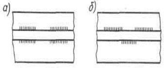 Шов может быть односторонним (рис. 38, г) и двусторонним (рис, 39, б,в), непрерывным или прерывистым с цепным (рис. 40, а) или шахматным (рис. 40, б) расположением свариваемых участков, точечным и др.