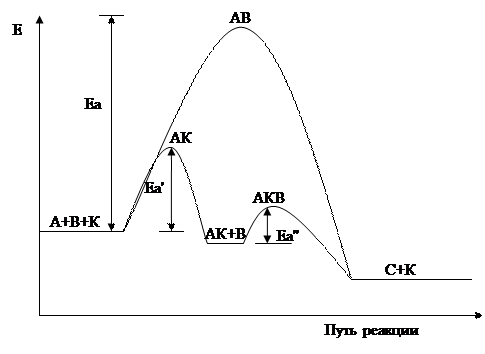 (синтез NH3 при обычных температурах). Путь реакции может быть изменен введением в систему катализаторов. Катализаторами называются вещества, которые влияют на скорость химической реакции, но их химический состав сохраняется после промежуточных стадий. Влияние катализаторов на скорость химических реакций называется катализом. Катализаторы могут снижать энергию активации, направляя реакцию по новому пути. Снижение энергии активации приводит к возрастанию доли реакционноспособных частиц и, следовательно, к ускорению процесса взаимодействия. Катализаторы, ускоряющие реакцию, называются положительными. Известны также отрицательные катализаторы (ингибиторы). Они замедляют реакцию, связывая активные промежуточные молекулы или радикалы, и тем самым препятствуют протеканию реакции. Катализаторы делятся на гомогенные и гетерогенные. Гомогенные находятся в одном и том же агрегатном состоянии хотя бы с одним из реагентов. Гомогенный катализ осуществляется чаще всего через образование неустойчивых промежуточных продуктов. Например, реакция А + В → С требует большой энергии активации Еа. В присутствии катализатора протекают реакции А + К → АК и АК + В → С + К, где К – катализатор.