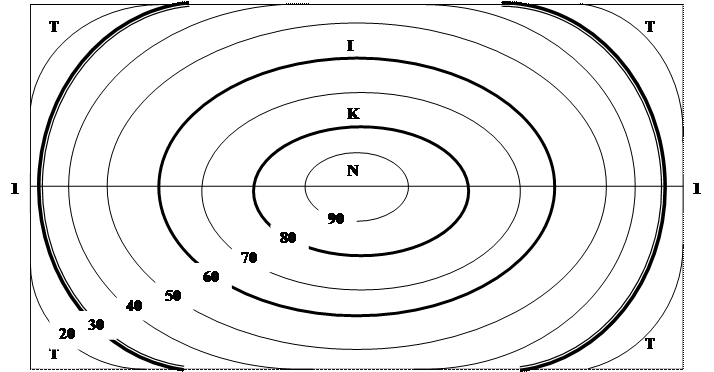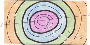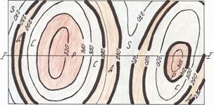 Рисунок 2- Карта гидроизогипс, карта гидроизобат Пример выполнения задания 6. По фрагменту геологической карты (рис.3) в направлении разреза 1-1 построить график (рис.4) в масштабах 1:1000 – вертикальный, 1:2000 – горизонтальный. Нанесение геологических слоёв произвести в хронологической последовательности, определить формы их залегания.