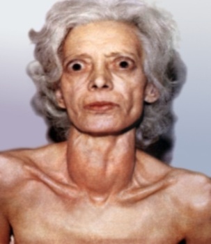 При этом увеличивается щитовидная железа (зоб), появляются экзофтальм, тахикардия, повышение обмена веществ, особенно основного. Больные худеют, имея повышенный аппетит (полифагия), температура тела повышена. Повышаются возбудимость и раздражимость.
